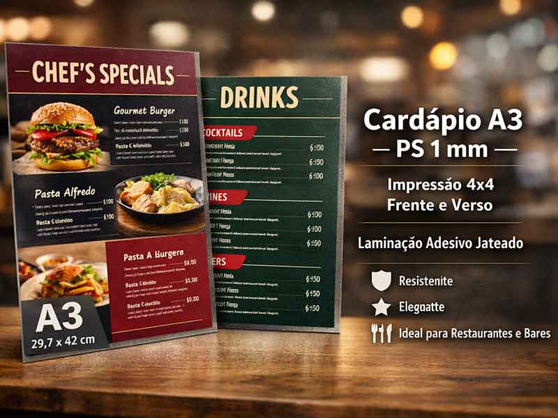 Cardápio A3 em PS 1 mm com impressão colorida frente e verso (4×4) e acabamento em laminação com adesivo jateado. Resistente, elegante e ideal para restaurantes, bares e lanchonetes que buscam durabilidade e apresentação profissional.